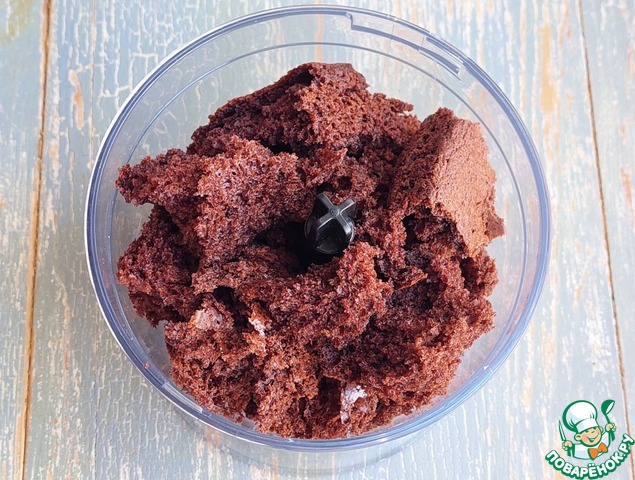 Готовый бисквит остудить, поломать на кусочки, переложить в блендер.