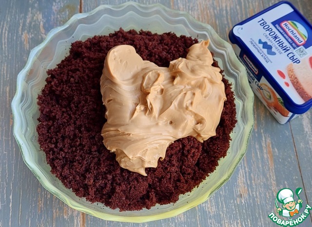 Полученный крем добавить в измельченный бисквит.