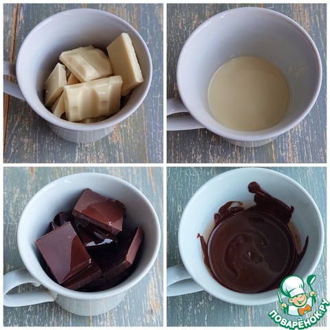 Через 30 мин. в отдельных емкостях поломать белый и тёмный шоколад, добавить к каждому по 10 мл. растительного масла и растопить (я растапливаю в микроволновке).