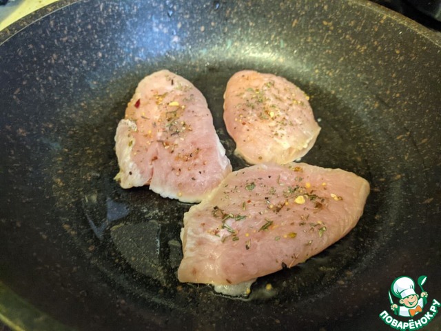Для приготовления этого сэндвича подойдёт любое готовое мясо индейки. Я предлагаю поджарить стейки из индейки. У меня - филе грудки индейки "Индилайт". Филе индейки режем на стейки толщиной 2 см, отбиваем, натираем солью, смесью перцев, приправами. У меня - базилик.