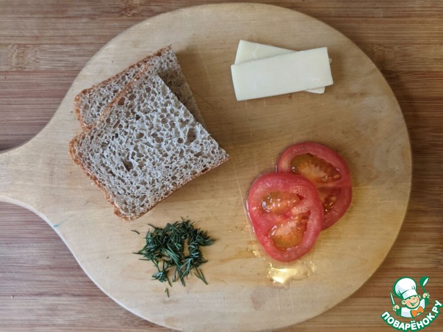 Далее всё готовится очень быстро, поэтому все продукты готовим заранее, чтобы были под рукой. Режем хлеб, у меня самый обычный - ржано-пшеничный. Твёрдый сыр режем пластиками. На слайсы режем помидор. Измельчаем укроп.