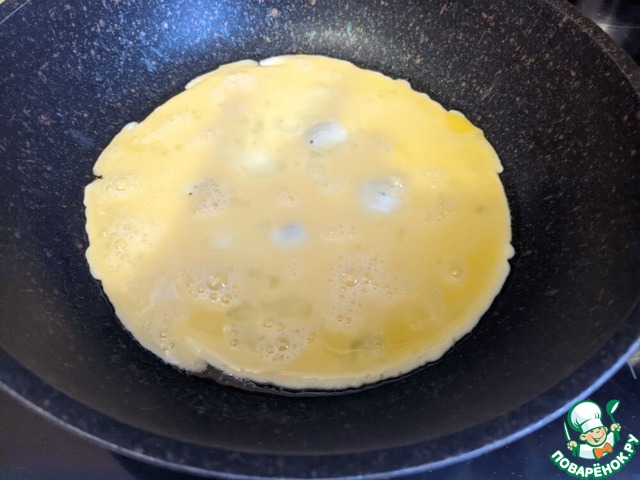 Даём омлету схватиться. Убавляем огонь до минимума, чтобы омлет не сгорел, пока будем с ним делать манипуляции. Заворачиваем края омлета с обеих сторон на хлеб.