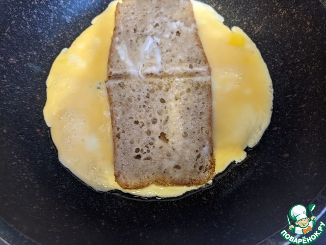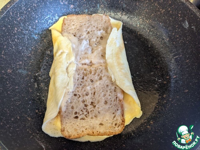 Кладём посредине два ломтика хлеба на небольшом расстоянии, сразу их переворачиваем, чтобы они были в омлетной смеси с обеих сторон.