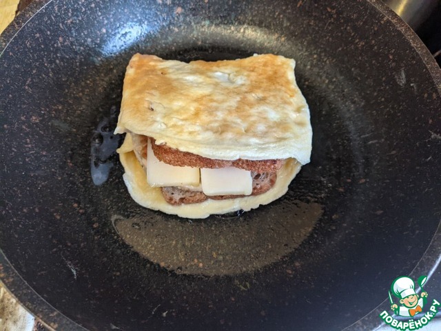 Поддеваем лопаткой или вилкой свободную сторону омлета и кладем её на начинку. Обжариваем сэндвич с двух сторон. Накрываем крышкой, доводим до готовности до расплавления сыра.