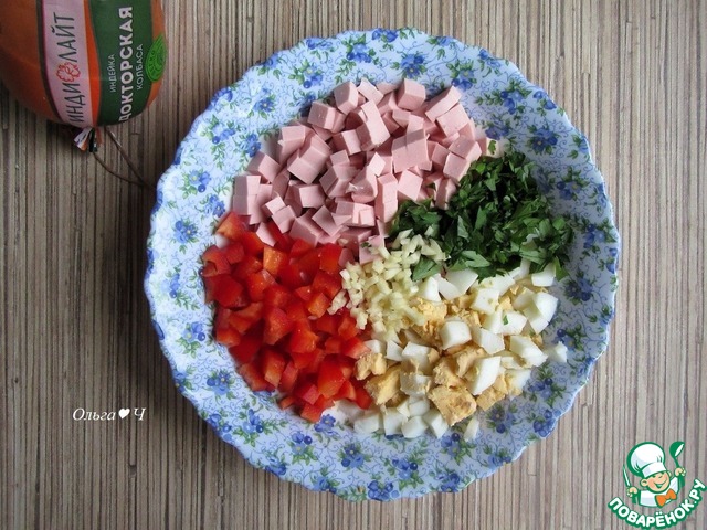 Нарежьте маленькими кубиками колбасу, сладкий перец и яйцо. Добавьте петрушку и измельченный чеснок.