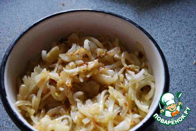 • Лук режем полукольцами и обжариваем на масле.