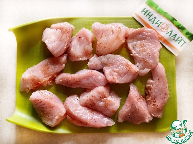 Филе индейки нарежьте на небольшие кусочки (всего должно получиться 12 шт). Приправьте солью, перцем и паприкой. Оставить промариноваться в течение 30 мин.