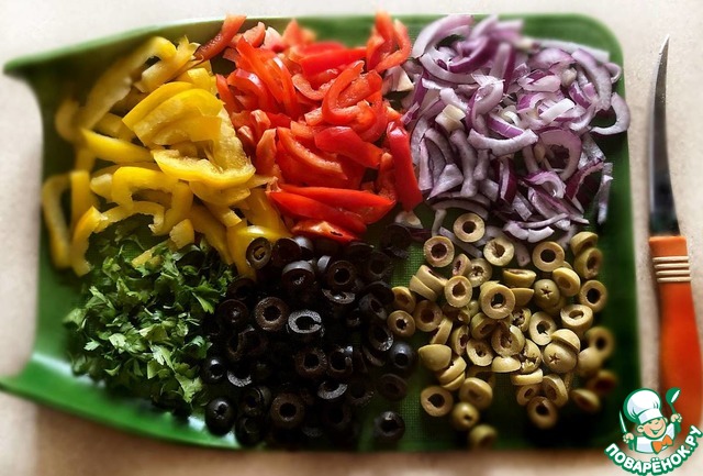 Лук почистите и нарежьте полукольцами. Маслины и оливки откиньте на сито, дайте стечь рассолу и нарежьте кольцами. Зелень петрушки порубите. Красный и жёлтый перец нарежьте небольшими полосками. Разогрейте в сковороде 2 ст л оливкового масла. Слегка обжарьте лук. Затем, добавьте перец, оливки и маслины и протушите в течение 2-х минут. Немного посолите, приправьте перцем.