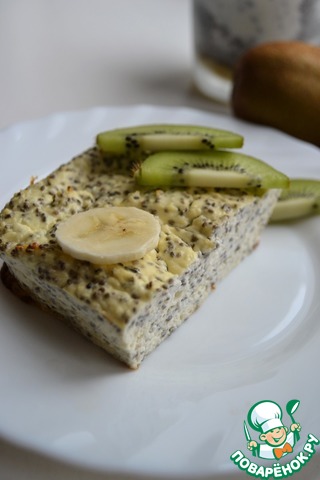 Вытащить запеканку из формы, нарезать, украсить нарезанными кусочками киви и банана.