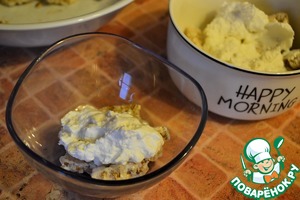Продолжать заполнять пиалы слоями: хлебцы, творожная масса, виноград, хлебцы и т. д., слегка "прижимая" десерт.