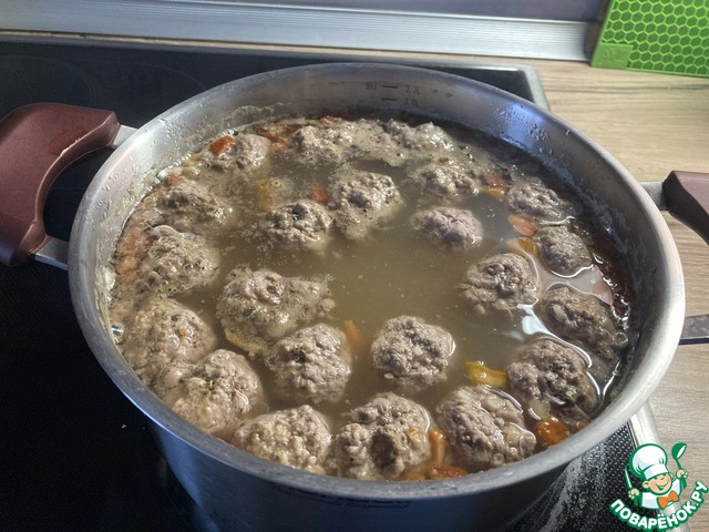 Через 20 минут опустить в кастрюлю фрикадельки, довести до кипения.