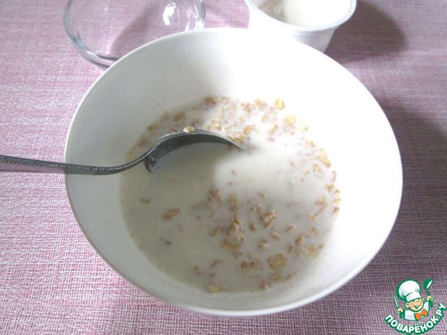 Овсяные хлопья предварительно замочить в горячем молоке. Я использовала овсянку среднего помола. Вы берите хлопья по своему вкусу и в зависимости от сорта, учитывайте необходимое время для их набухания (30 -60 минут или дольше).