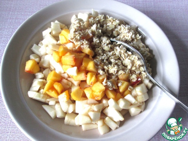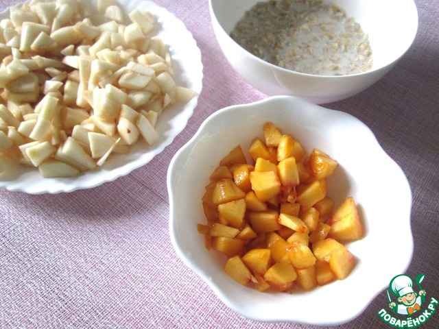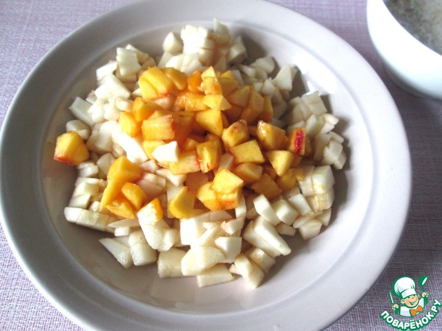 Яблоки и груши очистить, удалить сердцевину и мелко нарезать. Персик (или нектарин) очистить, удалить косточку и нарезать.
