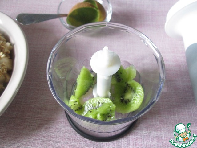 Приготовить заправку. Киви разрезать пополам, вынуть мякоть и поместить в блендер.