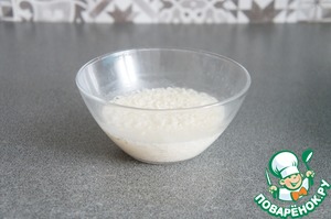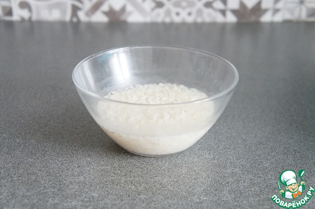 • Рис промыть, залить горячей водой и 1 минуту проварить в микроволновке. Воду слить.