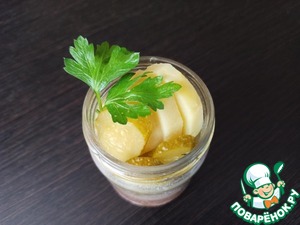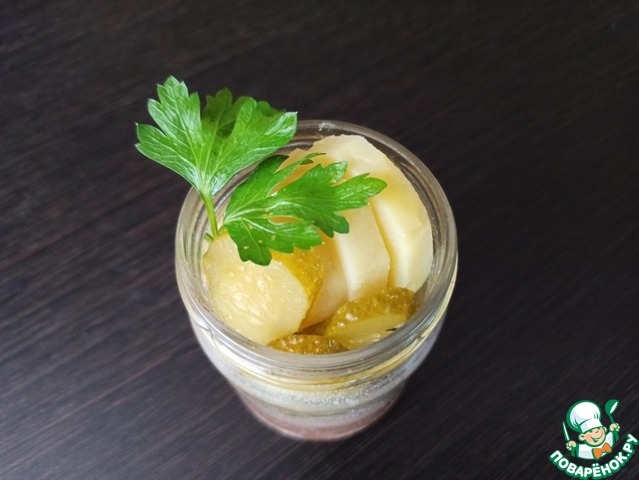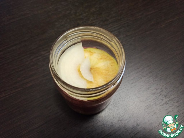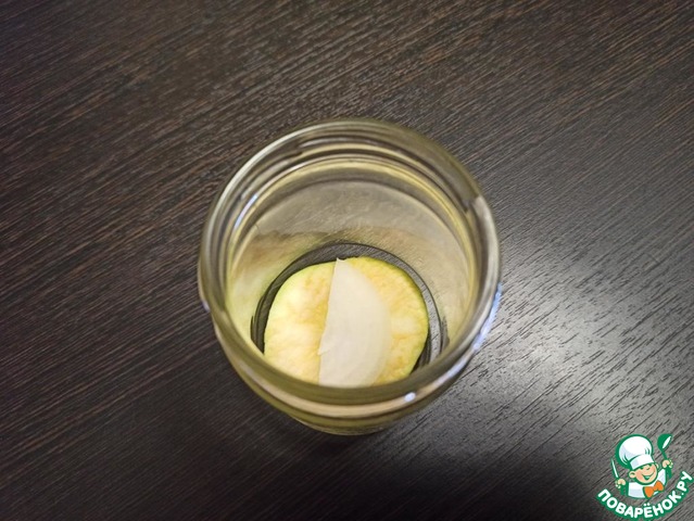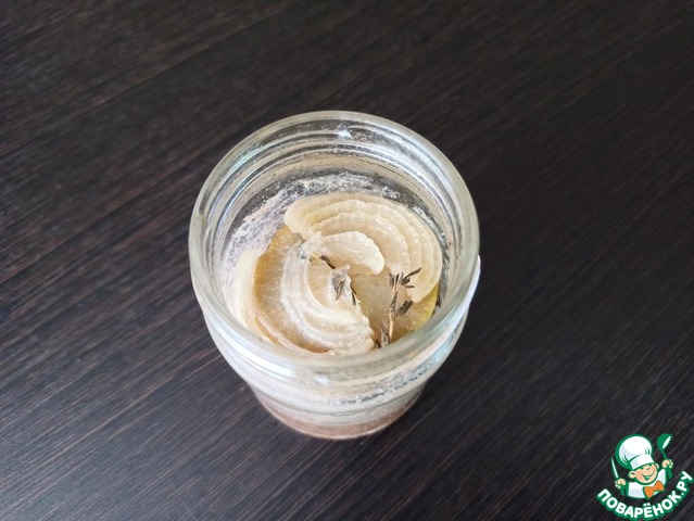 На дно банки объёмом 200 мл положить колечко зеленого яблока и колечко лука.