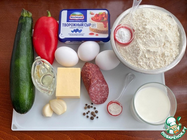В миске смешать : цукини, натертый на мелкой терке сыр, молоко, растительное масло, яйца, перец и салями.