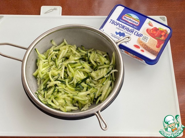 В первую очередь необходимо натереть на крупной терке, цукини. Присолить и затем отжать, появившийся сок.