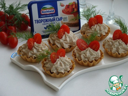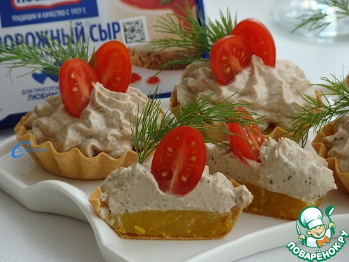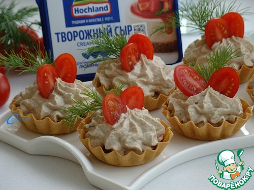 Паштет переложите в кондитерский мешок и украсьте тарталетки.