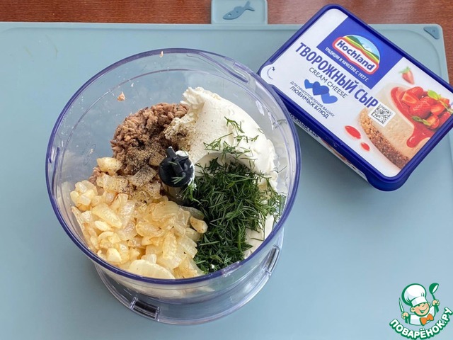 В чаше блендера, смешайте тунец, творожный сыр ТМ "Хохланд", обжаренный с чесноком лук, укроп.