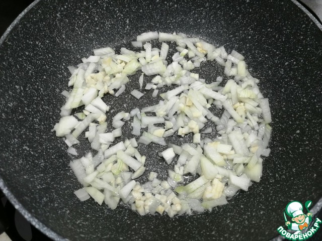 Масло разогреть в сковороде, обжарить лук и чеснок, часто помешивая, пока лук не станет мягким.