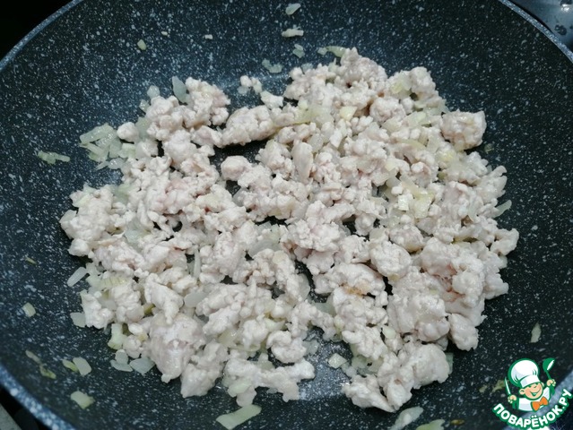 Положить фарш к луку и чесноку, обжаривать, постоянно помешивая, пока мясо не потеряет розовый цвет.