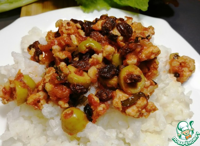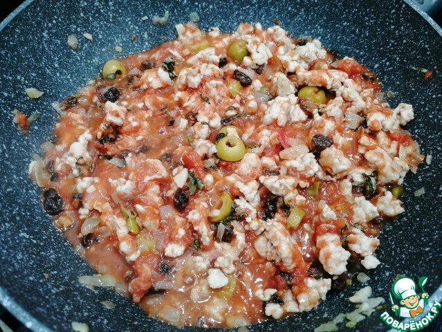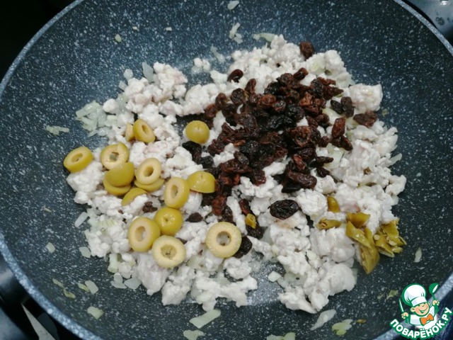 Добавить к фаршу изюм, измельченный маринованный перец, оливки.