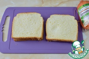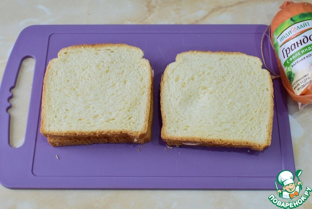 Накройте вторым ломтиком хлеба и прижмите. Можно сверху положить разделочную доску и прижать. Так все слои станут плотнее друг к другу и не будут разваливаться при жарке.