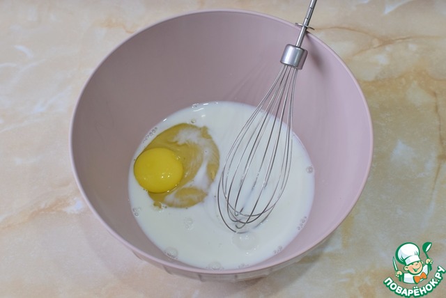 В глубокой чаше смешайте молоко с яйцом. Немного подсолите. Можно слегка взбить до легкой пены.