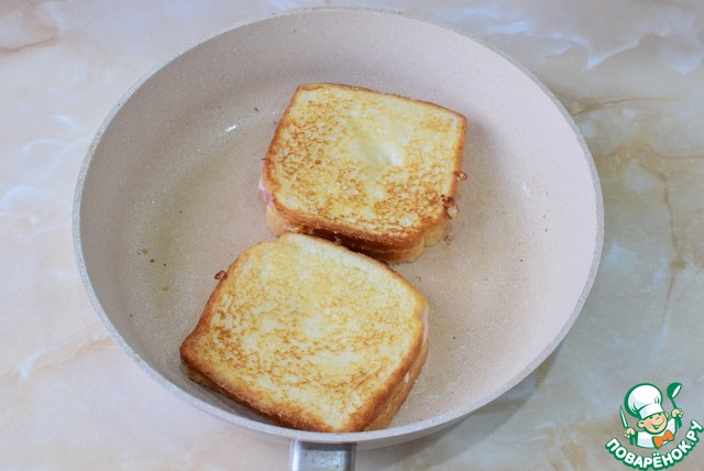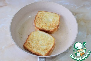 Каждый сэндвич окуните с двух сторон в молочную массу и выложите в сковороду.