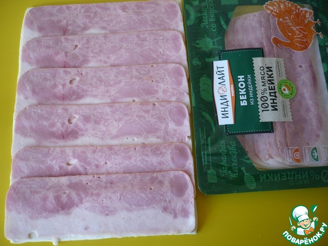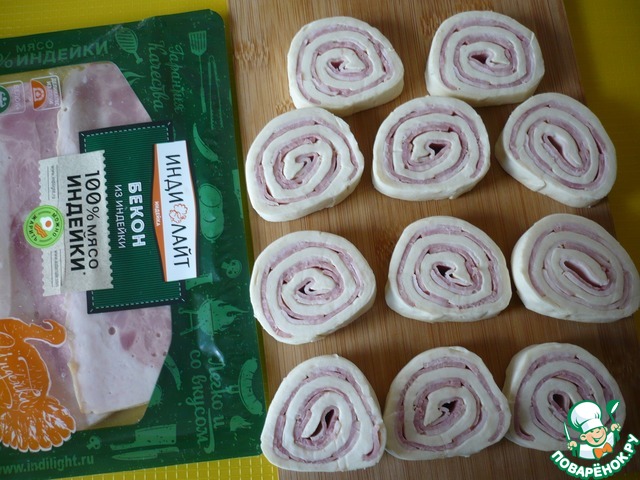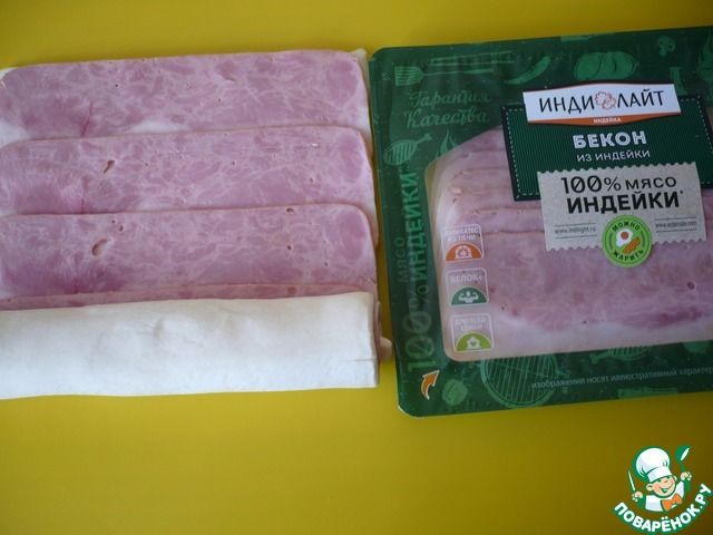 Теперь из слоеного теста и бекона из индейки ТМ "Индилайт" приготовим рулетики. Для этого возьмите два пласта слоеного теста (пласт теста весом 200 гр.) и на каждый выложите по нескольку ломтиков бекона.