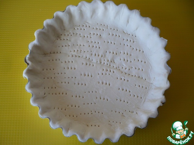 Выложите слоеное тесто в форму для выпечки пирога (d-21 см), наколите его вилкой, застелите тесто пергаментом и посыпьте дно сухой фасолью (горохом или рисом) и выпекайте в течение 10 минут при температуре 180 градусов.