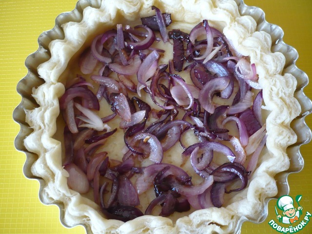 Красный лук нарежьте полукольцами и обжарьте его на сковороде, добавив растительное масло. Достаньте пирог из духовки и выньте пергамент с фасолью. На дно пирога выложите жаренный лук.