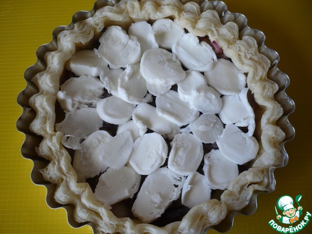 Выложите нарезанные ломтики сверху на пирог. Выпекайте 25-30 минут при температуре 180 градусов. Ориентируйтесь на свою духовку.