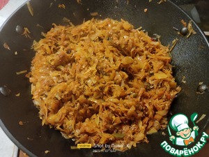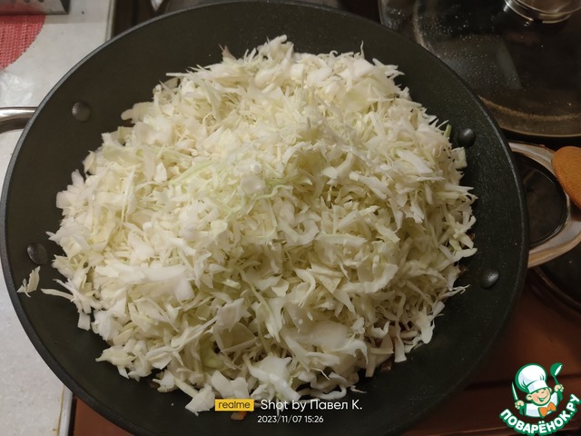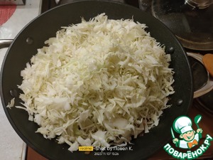 После этого добавляем на сковороду нашу капусту. У меня казан объёмом 4,4 литра, поэтому капуста вошла вся (800 грамм). Для тех, кто будет жарить на сковороде, капусту придётся добавлять в 2 этапа. Она очень быстро и хорошо ужаривается (теряет объем), поэтому через 3-5 минут вся капуста уже будет в вашей сковороде.