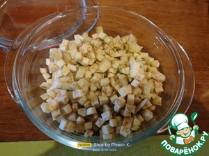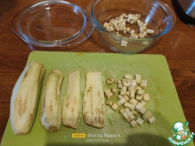 У баклажанов срезаем плодоножку, очищаем их от кожуры, разрезаем вдоль на несколько пластин, которые потом режем на некрупные кубики.