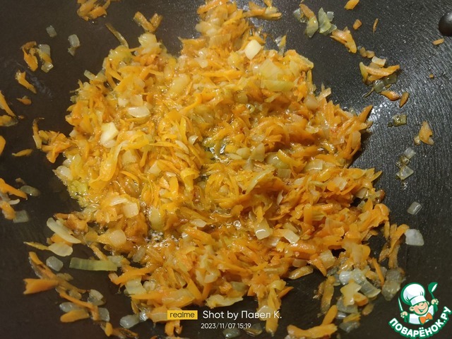 Затем к луку добавляем морковь, хорошо перемешиваем и жарим до полумягкого состояния (около 5 минут) на среднем огне периодически помешивая.
