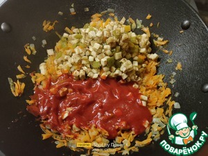 Выкладываем к луку с морковью наши баклажаны с перцем и сразу добавляем томатный соус.