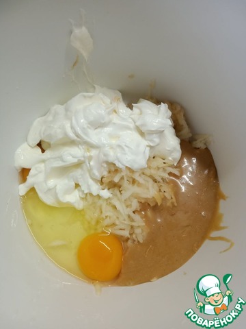 Процесс замеса теста происходит достаточно быстро и без миксера, включите сразу духовку на разогрев 190С.