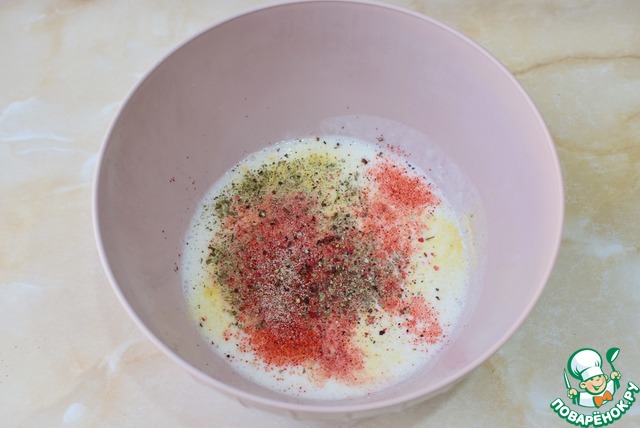 Для маринада налейте в чашу кефир. Добавьте к нему соль, молотый перец, паприку и сушеный базилик. Смешайте.