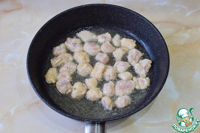 Для жарки берите глубокую сковороду. Налейте в неё растительное масло. Опускайте мясо в сковороду. Масло должно быть столько, чтобы кусочки в нём свободно перемещались. Сразу все выложить не получится. Жарьте в несколько подходов.