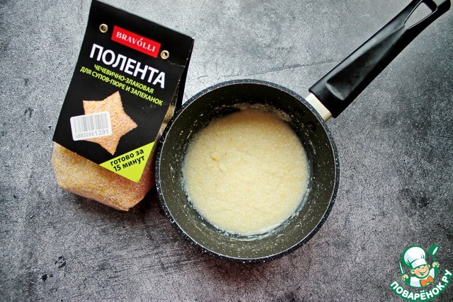 Воду доведите до кипения, всыпьте поленту и варите на медленном огне до густоты. Она не должна полностью свариться, а лишь набухнуть, снимите и дайте остыть.