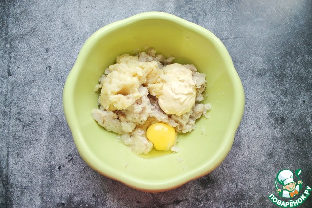 В чашку положите рыбный фарш, у меня из трески, добавьте яйцо, сваренную поленту и майонез. Все хорошо перемешайте.