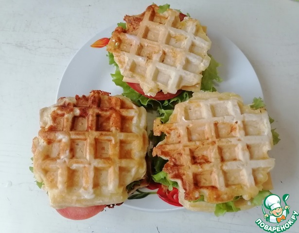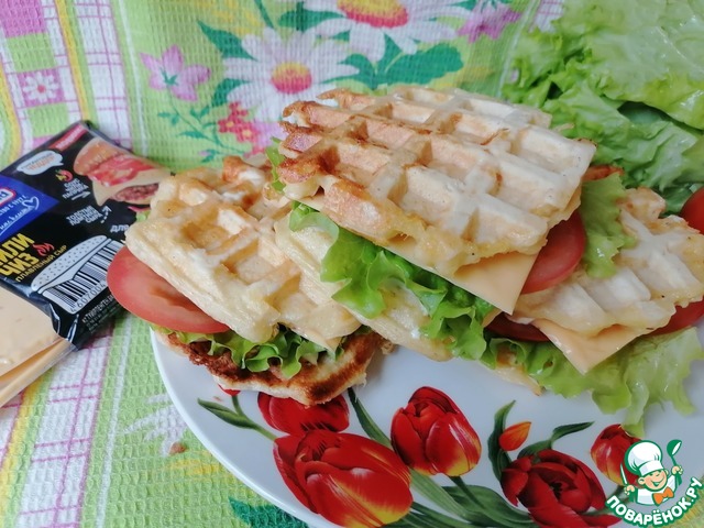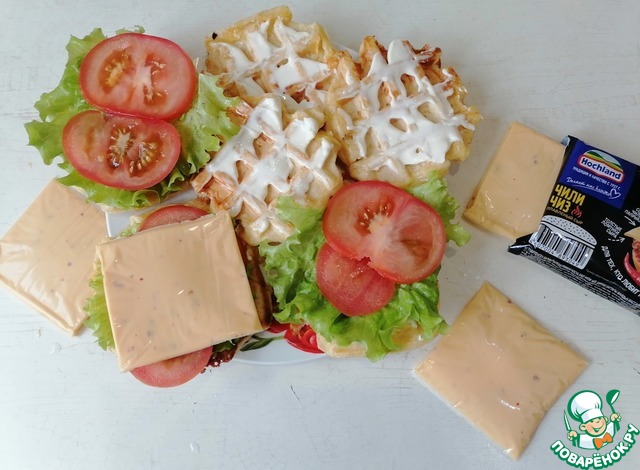 На каждую вафлю положить листик салат, помидор, нарезанный тонкими кружочками, и ломтик плавленого сыра. Плавленый сыр чили чиз с острыми нотками от Хохланд идеально подошел