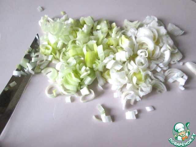 Белую часть лука-порея нарезать кружочками или мелкой соломкой.