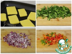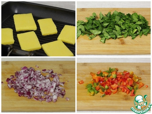 Пока полента обжаривается, подготовить овощи: шпинат нарезать, лук и перец нарезать на кубики, чеснок измельчить. -