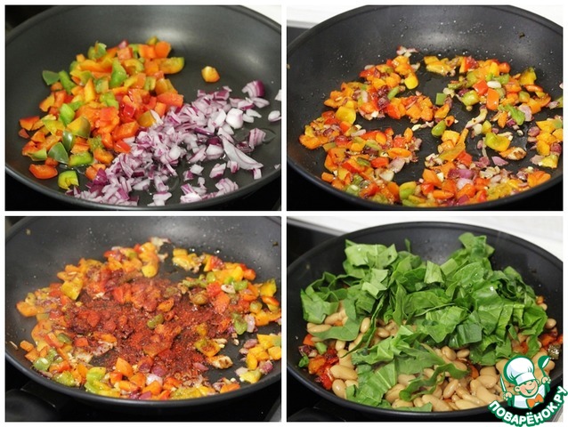 В сковороде разогреть растительное масло, добавить лук и перец, готовить до мягкости, периодически помешивая, 3–5 минут. Добавить соль, чеснок и паприку и готовить около 30 секунд.