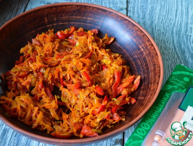 Добавить резанный перец, обжарить ещё 3 минуты, посолить, заправить специями по вкусу.