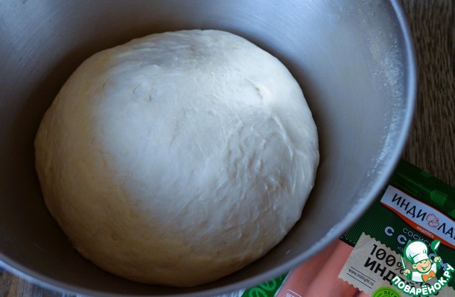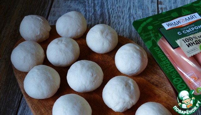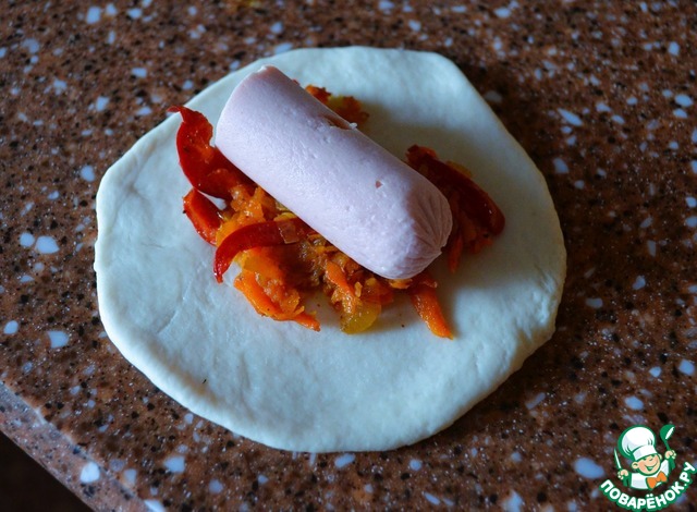 Колобок теста раскатать, положить 1,5 ч. л. начинки, на неё сосиску.