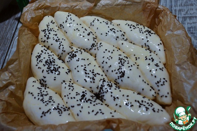 В огнеупорную форму постелить пергамент, разложить заготовки. Накрыть, оставить на расстойку, 25-30 минут. -